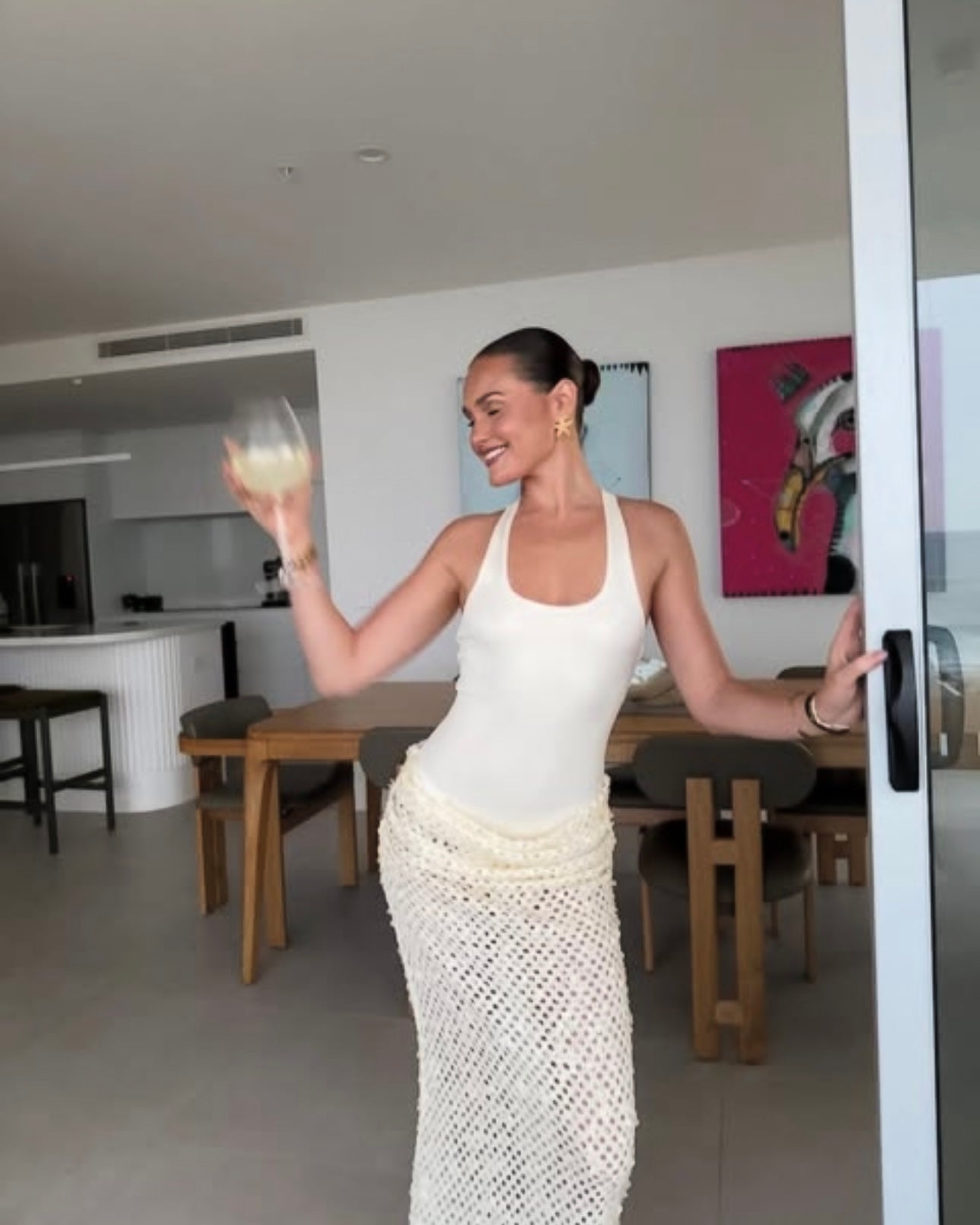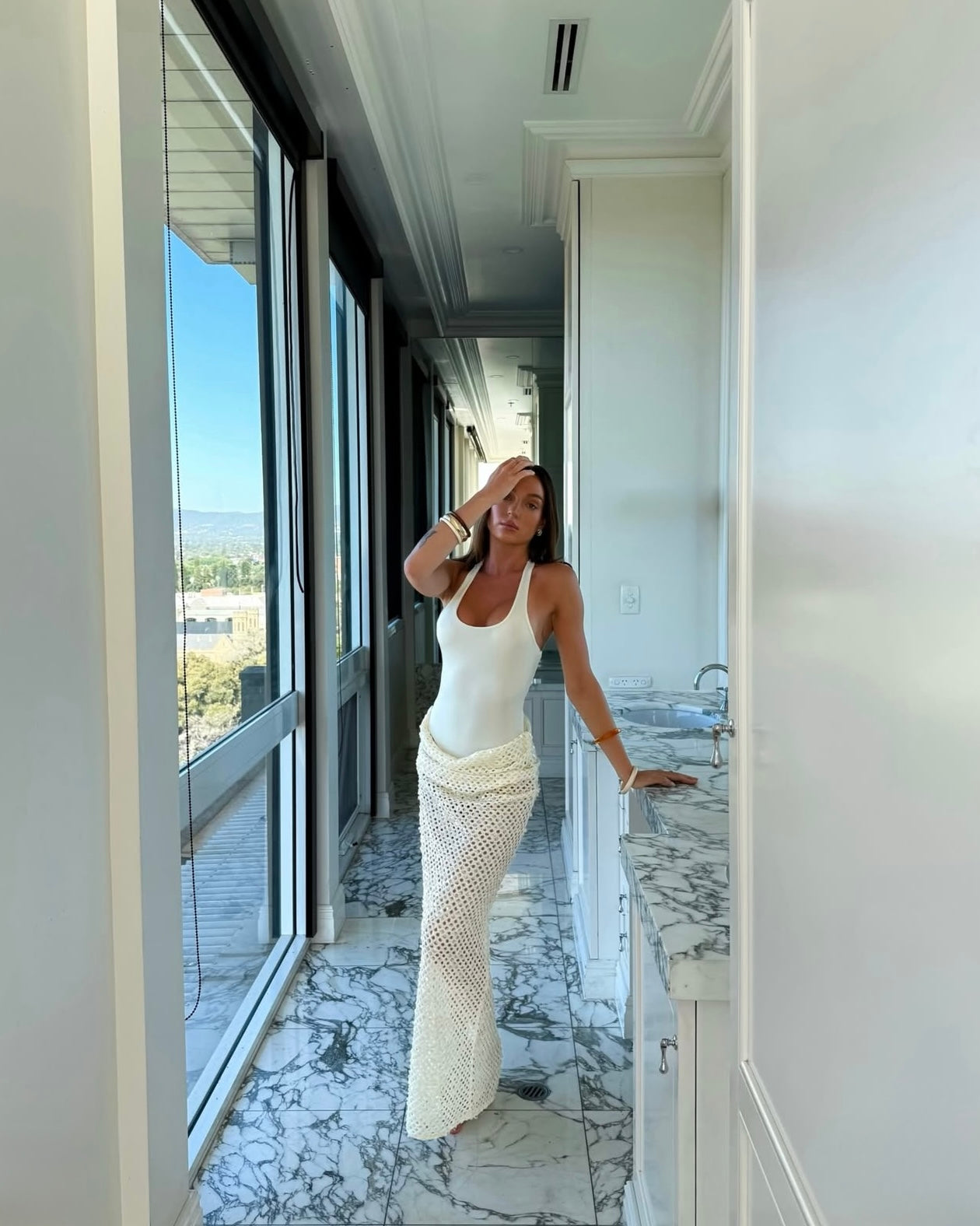 The Ariel Maxi in Shell by BENNI is the definition of effortless coastal elegance. Featuring a sleek, fitted bodice paired with a softly draped, open-weave crochet maxi skirt, this piece is made for golden hour moments and long summer evenings.