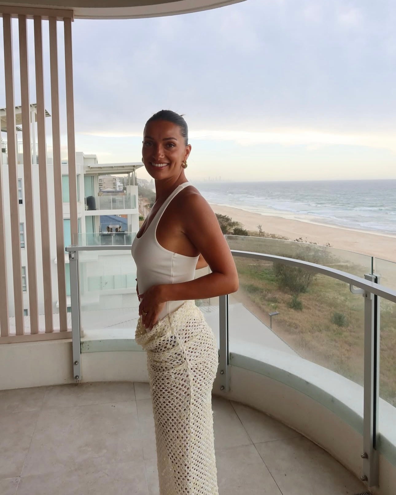 The racerback neckline and scoop front create a flattering, sculpted silhouette, while the textured crochet skirt adds movement and an elevated, resort-style feel. Finished in a warm shell/ivory tone, Ariel is the perfect balance of minimal and statement.